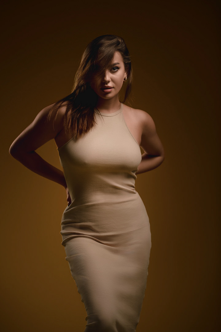 W świecie studia fotograficznego, gdzie światło tańczy z cieniami, rozpoczęła się fascynująca sesja portretowa. Tym razem główną bohaterką była modelka ubrana w elegancki strój, a jej styl dopełniał olśniewający, duży kapelusz. Kapelusz ten, jak korona unosił się ponad nią, nadając charakteru i tajemniczości całemu ujęciu.